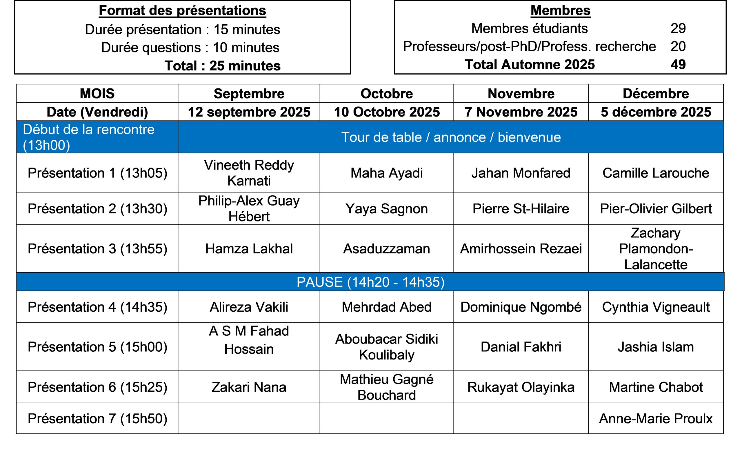 La programmation des rencontres pour la session d’automne 2025